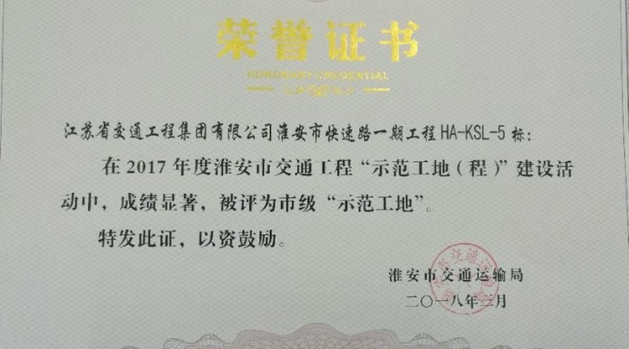 - 淮安市快速路5标荣获“示范工地”殊荣