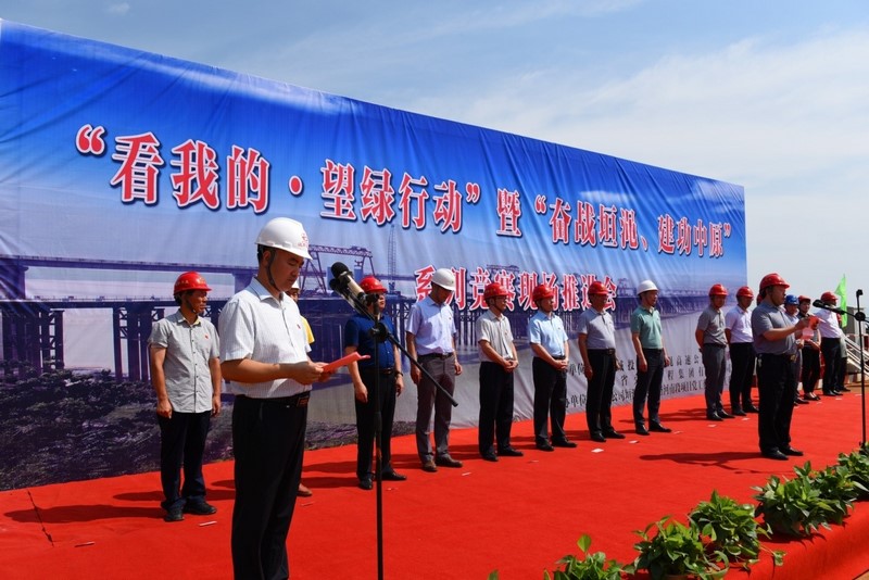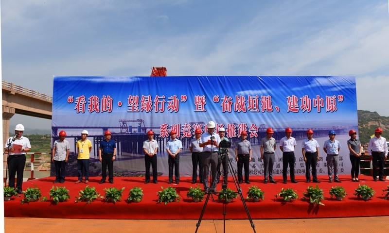 8月11日上午,河南省三门峡市黄河特大桥项目7号平台上彩旗飘扬,人头攒动,“加快建设垣渑高速公路项目,迎接党的十九大胜利召开”“打造垣渑精品工程、共筑绿地百年基业”“展示江苏交工风采、彰显绿地集团形象”等一条条展示信心、催人奋进的横幅标语悬挂在施工现场不同区域,党员先锋工程、党员突击队、青年突击队的鲜红旗帜迎风飘扬。由绿地城投集团垣渑高速公路指挥部和开云手机版登录入口联合主办的“垣渑高速公路‘看我的·望绿行动’暨‘奋战垣渑、建功中原’系列竞赛现场推进会”在这里隆重举行,吹响了垣渑高速公路项目大干快上的集结号。