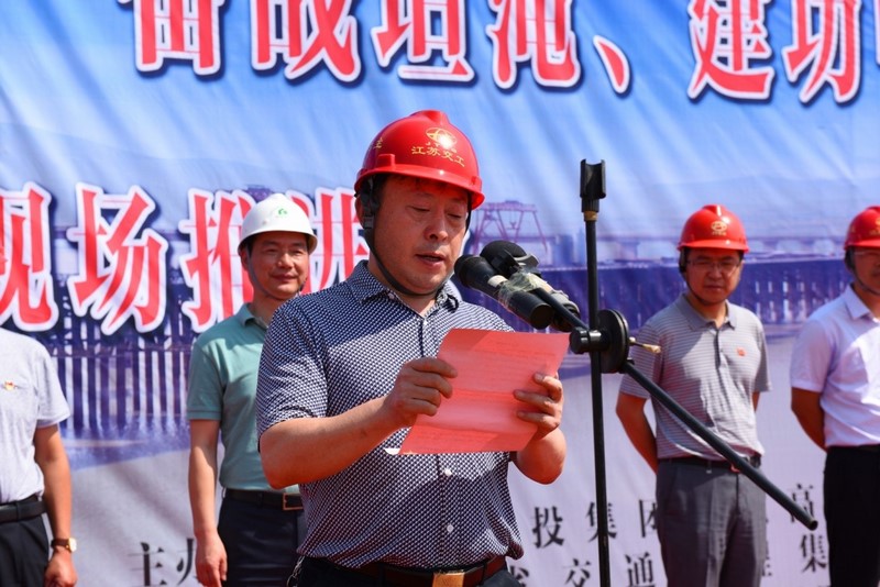 镇江市交通运输局组织人事处处长蔡国华分别向5个项目部授“青年突击队”旗帜。