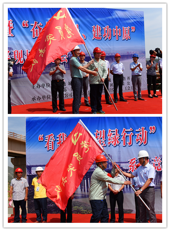 上图为绿地城投集团总裁助理、垣渑高速公路指挥部总指挥王家文、副总指挥王春升授“党员突击队”旗帜