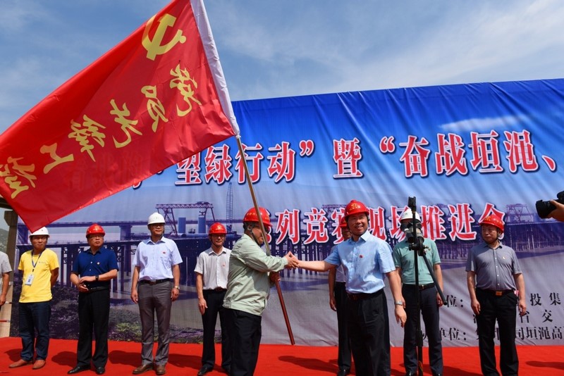 为进一步鼓舞士气,增强动力,提升干劲,推进会上镇江市铁路办主任、市交通运输局党委副书记翟胜勇先生向垣渑高速项目党工委书记樊明再授予了“党员先锋工程”旗帜。绿地城投集团总裁助理王家文先生和绿地城投集团垣渑高速项目常务副总指挥王春生先生授分别向项目经理黄大鹏和陈勇授予了“党员突击队”旗帜。渑池县人民政府党组成员黄世民先生、渑池县交通运输局局长张万幸先生、渑池县交通运输局党委副书记冯正军先生、镇江市交通工会主任赵国华先生、镇江市交通运输局组织人事处处长蔡国华先生分别向5个项目部授予了“青年突击队”旗帜。