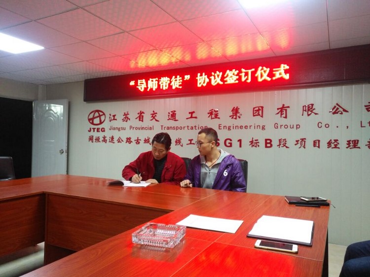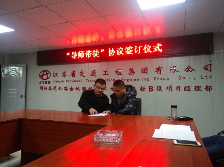 为了教育和引导青年员工立足岗位、敬业爱岗,熟练掌握各项业务和理论技能,帮助青年员工尽快成长成才,南京分公司闻垣高速SG1合同段B段项目部于3月23日举办了“导师带徒”协议签订拜师仪式,项目部部门以上和所有技术人员共同见证了这一仪式。